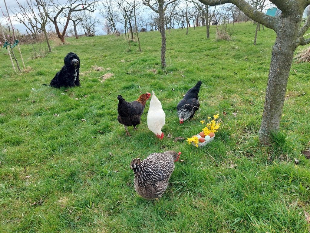Unsere vier Hühner sowie die gefiederten Bewohner verschiedener Nistkästen helfen uns bei der Schädlingsabwehr. Wir verwenden nur selbst hergestellte Pflanzenbrühen (Brennnessel, Schachtelhalm usw.) zum Pflanzenschutz.