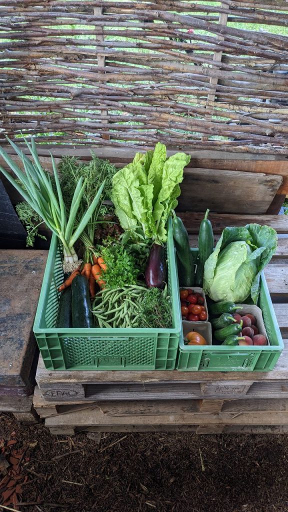 Überall summt und brummt, krabbelt und hüpft es auf unserem Acker. Aber auch die Schädlinge sind dieses Jahr sehr aktiv! Erdflöhe, Blattläuse, Gemüsewanzen, Drahtwürmer und seit neuestem eine Wühlmaus machen dem Gemüse zu schaffen. Dieses Jahr haben wir einiges an Ausfällen. Und dennoch ist die Gemüsekiste jede Woche gut gefüllt. Vielfalt macht sich auch in der Anbauplanung bezahlt. Wir haben jede Woche ca. 8 verschiedene Gemüse und zusätzlich verschiedene Kräuter und seit Juni auch Obst in den Kisten – Erdbeeren, Stachelbeeren, Johannisbeeren und jetzt auch Pfirsiche.